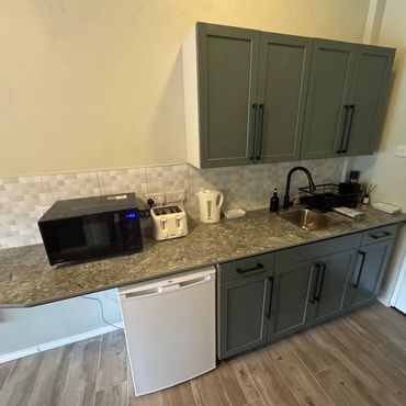 - Kitchenette (microwave, fridge, kettle, toaster).